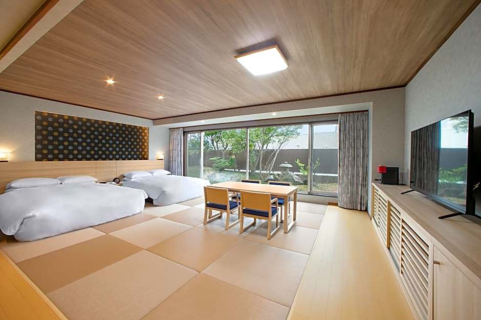 The spacious quadruple room provides air conditioning, tatami, as well as a private bathroom featuring a bath and a shower. The quadruple room offers a coffee machine, a wardrobe, a safe deposit box, a carpeted floor and a flat-screen TV. The unit offers 2 beds and 2 futons.
